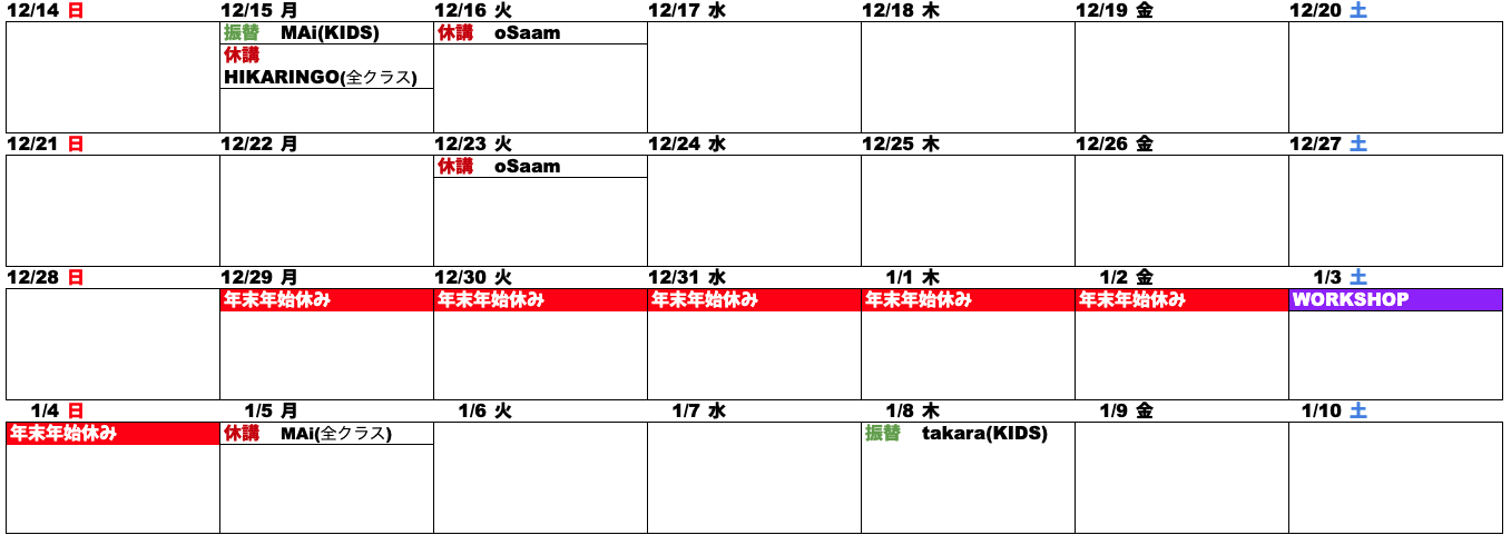 【休講】12/23(火)oSaam1/5(月)MAi(全クラス)1/13(火)FunkuP→練習会1/31(土)HARUTO(全クラス)2/21(土)EKO2/28(土)EKO3/5(木)AKARI4/2(木)takara(全クラス) 【振替】1/8(木)takara(KIDS)1/11(日)HARUHI(全クラス)1/11(日)HARUTO(全クラス)1/12(月)MAi(KIDS)1/15(木)takara(KIDS)
