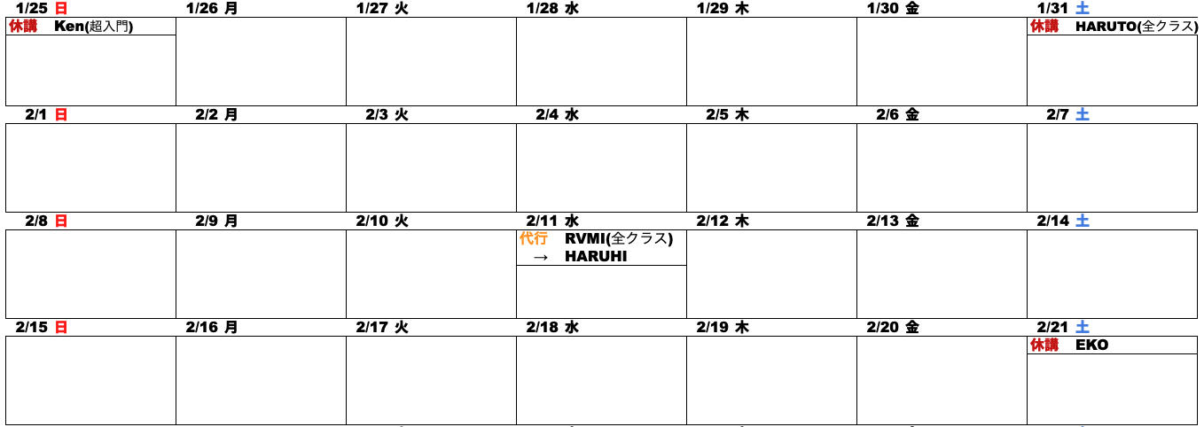【休講】1/31(土)HARUTO(全クラス)2/21(土)EKO2/23(月)MAi (全クラス)2/23(月)HIKARINGO2/28(土)EKO3/5(木)AKARI3/26(木)takara(全クラス)4/2(木)takara(全クラス) 【代講】2/11(水)RVMI(全クラス)→HARUHI